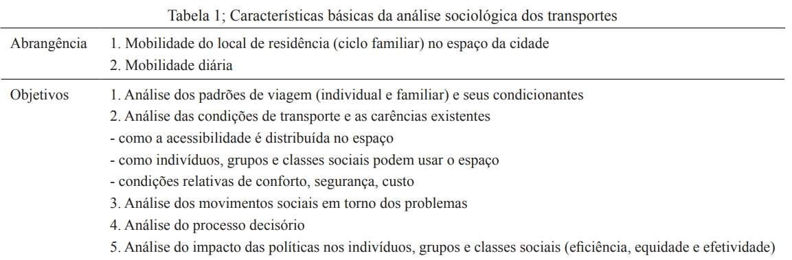 Há ainda uma definição mais aprofundada, segundo a qual esse conceito consiste na capacidade de um indivíduo se deslocar, envolvendo dois componentes: (a) a performance do sistema de transporte (infraestrutura de transporte, horários e rotas) e (b) as características do indivíduo e das suas necessidades (se possui carro próprio ou renda para utilizar o transporte desejado) (Raia Junior, 2000, citado por Cardoso, 2008). Desse modo, o trânsito pode tornar-se inviável a partir do momento que acontece uma “falha” ou limitação em algum desses dois componentes. Problemas na infraestrutura de transporte e a qualidade do próprio transporte utilizado comprometem a mobilidade das pessoas e, consequentemente, a capacidade de transitar delas. A Sociologia do Trânsito tem mais detidamente estudado acerca de aspectos da mobilidade, apresentados na Tabela 1. Ao analisar a estratégia familiar de deslocamentos conjuntos, em complemento à estratégia individual, esta área de estudos torna-se apta a verificar como as diferenças sociais, políticas e econômicas entre as classes e grupos sociais influenciam as condições individuas de deslocamento (Reichman, 1983, citado por Vasconcelos, 2001), posto que, embora condicionados pela ação dos indivíduos, os deslocamentos são também altamente dependentes das características familiares (renda, escolaridades, idades, relações de gênero) que limitam as possibilidades de escolha de deslocamento.