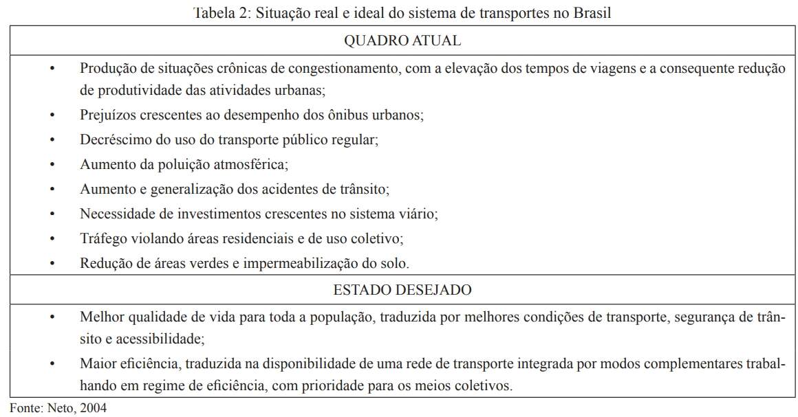 Segundo Cardoso (2008), a desigualdade social resulta de diversos fatores: (a) o desempenho da economia; (b) as condições socioeconômicas das diferentes populações que habitam a cidade; (c) a distribuição urbana, principalmente o fosso entre os locais de moradia, as atividades socioeconômicas e as infraestruturas públicas (hospitais, escolas, etc.) e (d) o atendimento do transporte coletivo público à população nas diferentes regiões da cidade. O transporte público coletivo, por sua vez, é tratado como coisa menor, “para pobres”, não merecendo ser contemplado como atividade estratégica por parte da União, estados ou municípios. As cidades têm sido moldadas para atender unicamente ao automóvel, arrastando o transporte público sem prioridade para uma crise de perda de atratividade. Tal política impõe uma das piores iniquidades - a da acessibilidade. Cria dois tipos de cidadãos: aqueles que possuem automóvel, e aqueles que não possuem e dependem do transporte público (Neto, 2004), reforçando os fenômenos da desigualdade de oportunidades e da segregação espacial, propiciadores de exclusão social (Gomide, 2006). A qualidade e a acessibilidade ao transporte coletivo são temas bastante tratados nas áreas da Engenharia de Transporte e Urbanismo durante os últimos anos. Ao mesmo tempo, nas áreas de Serviço Social e Ciências Sociais, trabalhos têm buscado identificar a espacialidade da desigualdade social. Um avanço em Psicologia do Trânsito consistiu em que esta área deixasse de ser vista apenas como avaliação psicológica para habilitação de condutores, passando a compreender também o potencial da área em planejamento urbano e educação, juntamente com essas outras áreas do conhecimento (Conselho Federal de Psicologia, 2000), a fim de colaborar para o alcance de uma condição de convivência no trânsito mais racional, equânime e saudável. Encontram-se comparados na Tabela 2 o cenário atual e o desejado no setor de transporte brasileiro, externando uma lacuna que precisa ser diminuída pelos esforços compartilhados das áreas de conhecimento, dentre elas a Psicologia do Trânsito.