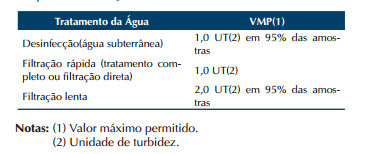Art. 12. Para a garantia da qualidade microbiológica da água, em complementação às exigências relativas aos indicadores microbiológicos, deve ser observado o padrão de turbidez expresso na Tabela 2, abaixo:
