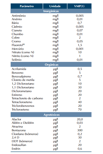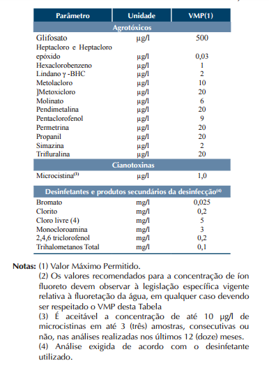 Art.14. A água potável deve estar em conformidade com o padrão de substâncias químicas que representam risco para a saúde expresso na Tabela 3, a seguir: