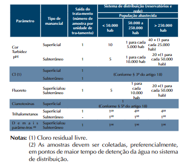 No número mínimo de amostras coletadas na rede de distribuição, previsto na Tabela 8, não se incluem as amostras extras (recoletas). Em todas as amostras coletadas para análises microbiológicas deve ser efetuada, no momento da coleta, medição de cloro residual livre ou de outro composto residual ativo, caso o agente desinfetante utilizado não seja o cloro. Para uma melhor avaliação da qualidade da água distribuída, recomenda-se que, em todas as amostras referidas no deste artigo, seja efetuada a determinação de turbidez. Sempre que o número de cianobactérias na água do manancial, no ponto de captação, exceder 20.000 células/ml (2mm3/l de biovolume), durante o monitoramento que trata o do artigo 19, será exigida a análise semanal de cianotoxinas na água na saída do tratamento e nas entradas (hidrômetros) das clínicas de hemodiálise e indústrias de injetáveis, sendo que esta análise pode ser dispensada quando não houver comprovação de toxicidade na água bruta por meio da realização semanal de bioensaios em camundongos.