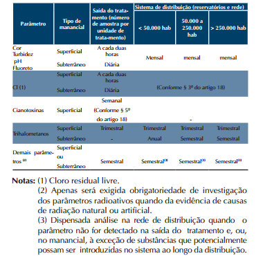 Art. 19. Os responsáveis pelo controle da qualidade da água de sistemas e de soluções alternativas de abastecimento supridos por manancial superficial devem coletar amostras semestrais da água bruta, junto do ponto de captação, para análise de acordo com os parâmetros exigidos na legislação vigente de classificação e enquadramento de águas superficiais, avaliando a compatibilidade entre as características da água bruta e o tipo de tratamento existente.