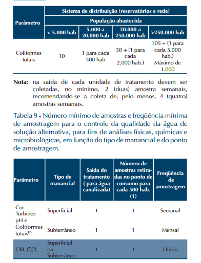 Devem ser retiradas amostras em, no mínimo, 3 pontos de consumo de água. Para veículos transportadores de água para consumo humano, deve ser realizada 1 (uma) análise de CRL em cada carga e 1 (uma) análise, na fonte de fornecimento, de cor, turbidez, PH e coliformes totais com frequência mensal, ou outra amostragem determinada pela autoridade de saúde pública. Cloro residual livre.