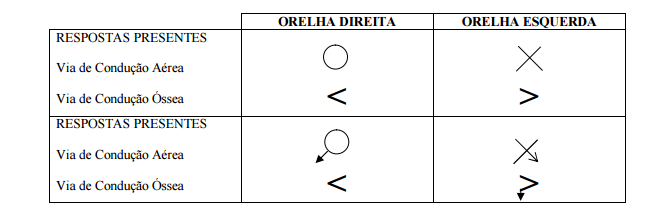1. Os símbolos referentes à via de condução aérea devem ser ligados através de linhas contínuas para a orelha direita e linha interrompidas para a orelha esquerda.