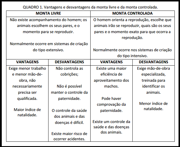 As maneiras como o homem orienta ou facilita a união sexual é chamada de tipos de monta, que deve ser escolhida de maneira a aproveitar a capacidade de cada animal e melhorar o seu rendimento como reprodutor. O quadro abaixo irá exemplificar os dois tipos e quais são suas vantagens e desvantagens.