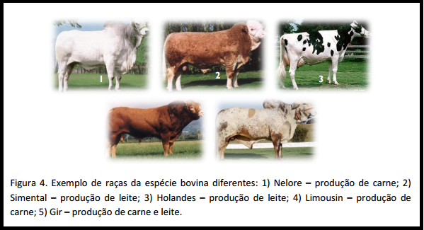 Na espécie de bovinos temos várias Raças. Ex. Nelore, Simental, Holandês, Limousin, Gir, etc.