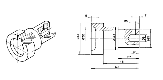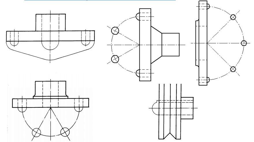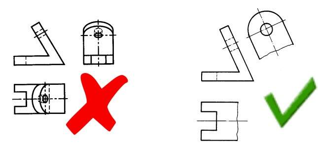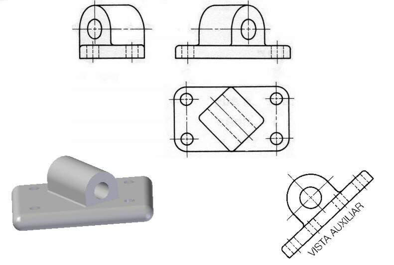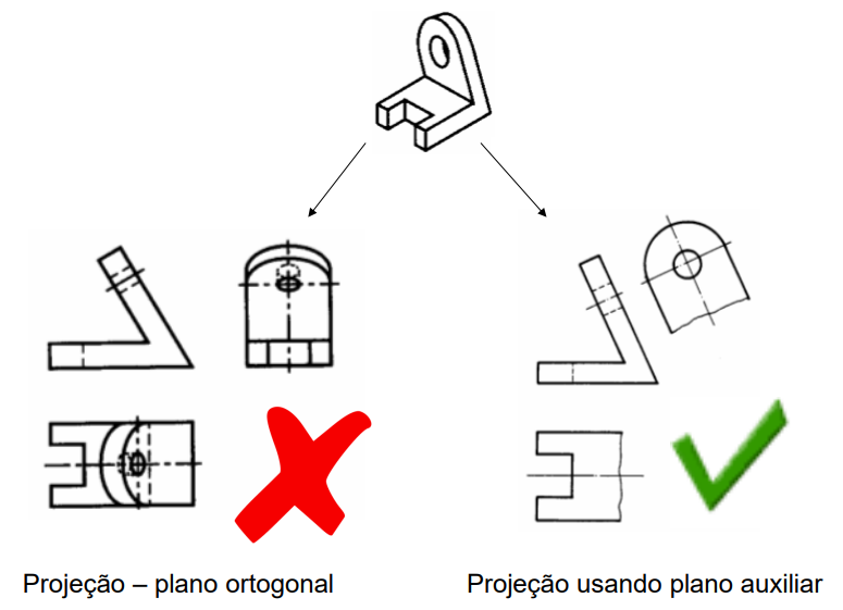 É necessário usar as VISTAS AUXILIARES em peças cujas projeções ortogonais ficam distorcidas devido a uma (ou mais) face(s) oblíqua(s) ou onde se deseja representar uma vista em verdadeira grandeza.