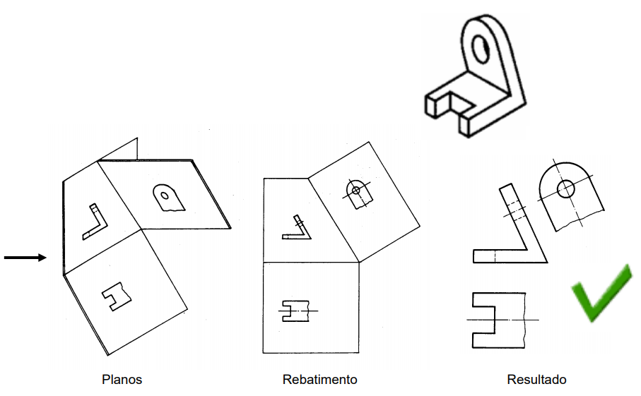 São projeções com posição do observador indicada por setas e letras quando não representadas na posição normal de rebatimento.
