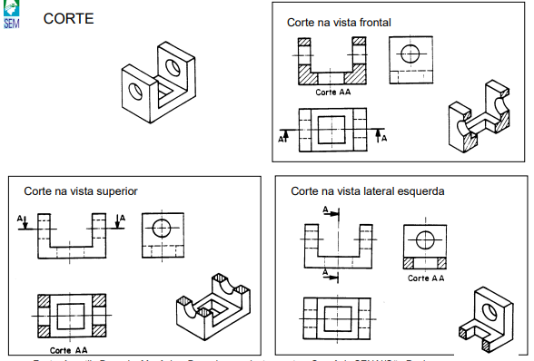 No contexto de interpretação de desenho técnico mecânico, a aplicação de setas acompanhadas de letras assume um papel crucial na comunicação visual. A expressão "corte AA" é estrategicamente posicionada abaixo da vista hachurada, indicando de maneira clara e precisa a localização do corte no desenho. Notavelmente, as vistas não afetadas pelo corte mantêm todas as linhas, garantindo a integridade das informações visuais.