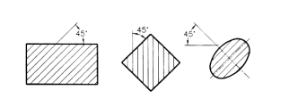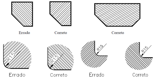 As hachuras não devem ter a mesma inclinação de arestas das peças, nem das cotas. Também não devem interceptar dimensões.