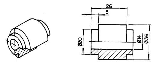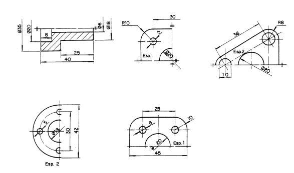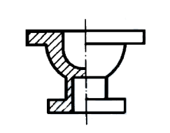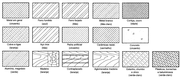 As hachuras também mostram os tipos de materiais; embora se utilize atualmente apenas a de ferro fundido, independentemente do material.
