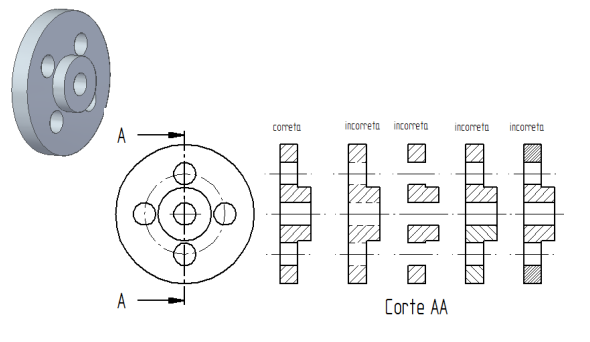 Em peças com a linha de simetria horizontal, o meio corte é representado na parte INFERIOR da linha de simetria.