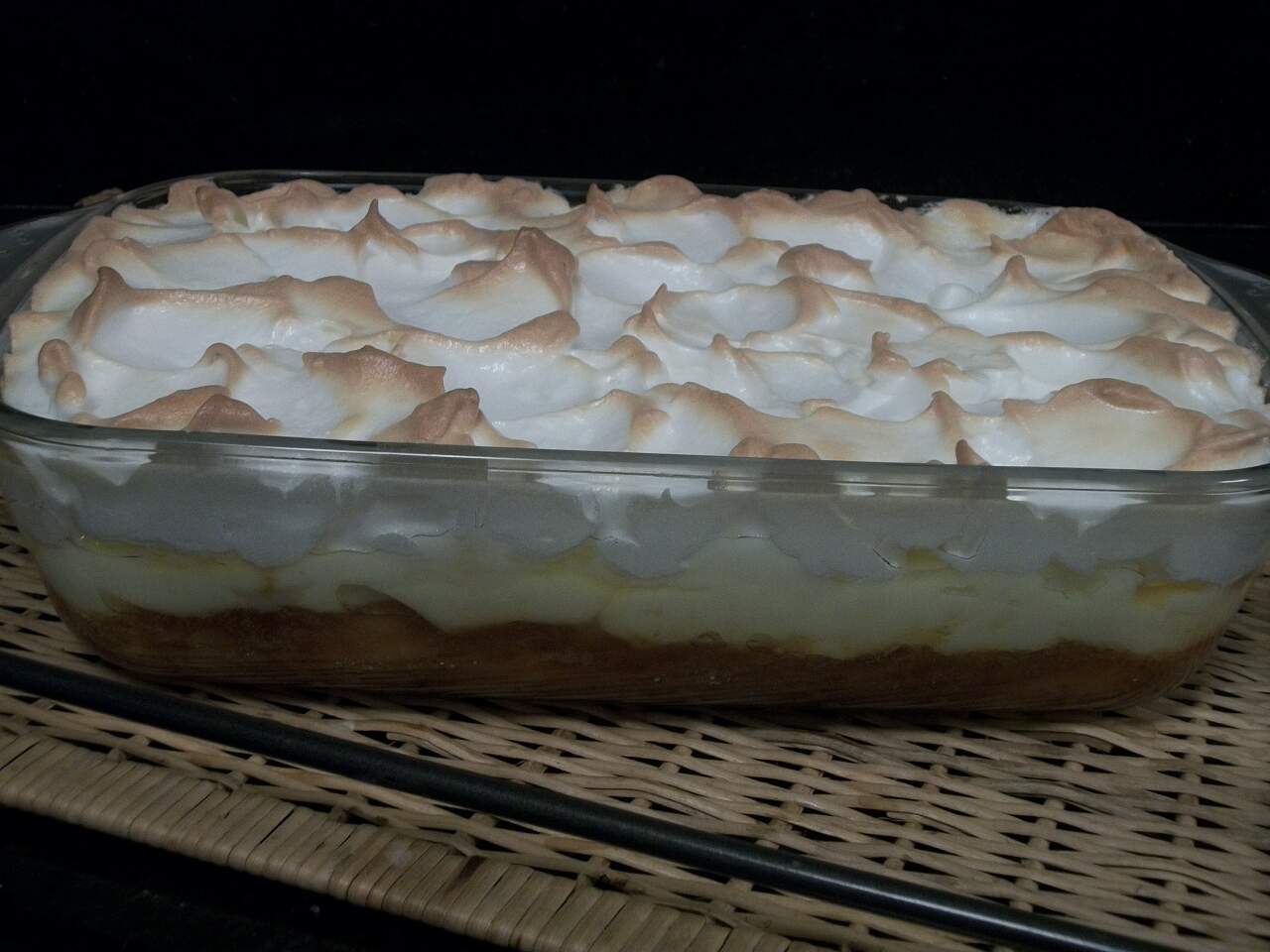 Levar ao fogo os ingredientes do creme e colocar sobre as bananas bater as claras em neve com o açúcar e colocar em cima.