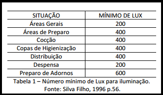 Os estabelecimentos devem ter iluminação natural ou artificial que possibilite a realização dos trabalhos e não comprometa a higiene e as características sensoriais dos alimentos, com níveis de iluminância conforme a Tabela 1, e com temperatura de cor que não altere a tonalidade real dos alimentos.