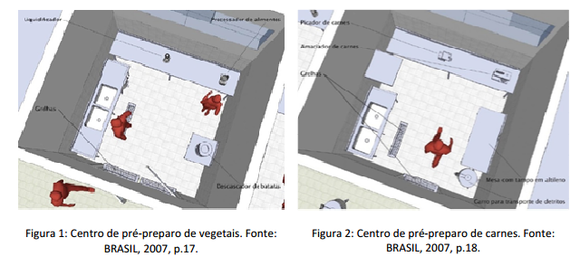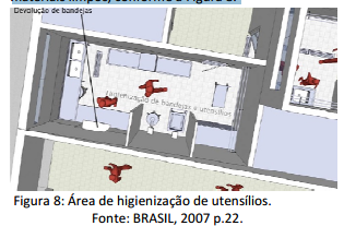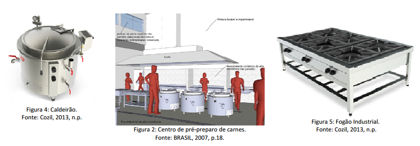 Assim, as áreas de circulação devem ter no mínimo 1,20m de largura, as áreas de circulação entre os equipamentos devem ter cerca 0,90m e diante dos caldeirões, 1,20m (SILVA FILHO, 1996)