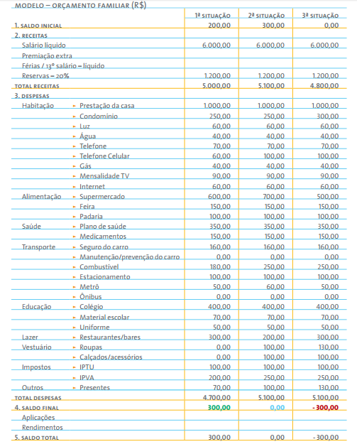 • 3ª situação: o saldo final é negativo. Essa é a situação mais complicada, pois as despesas superam as receitas. Nesse caso, para equilibrar o orçamento a saída é recorrer a financiamentos, ou seja, mais dívidas. Se essas dívidas não estiverem sob controle, os juros poderão prejudicar ainda mais as finanças. Para quem está nesta situação é hora de rever as despesas a fim de equilibrar o orçamento familiar. Veja a seguir algumas dicas de como lidar com o saldo negativo.