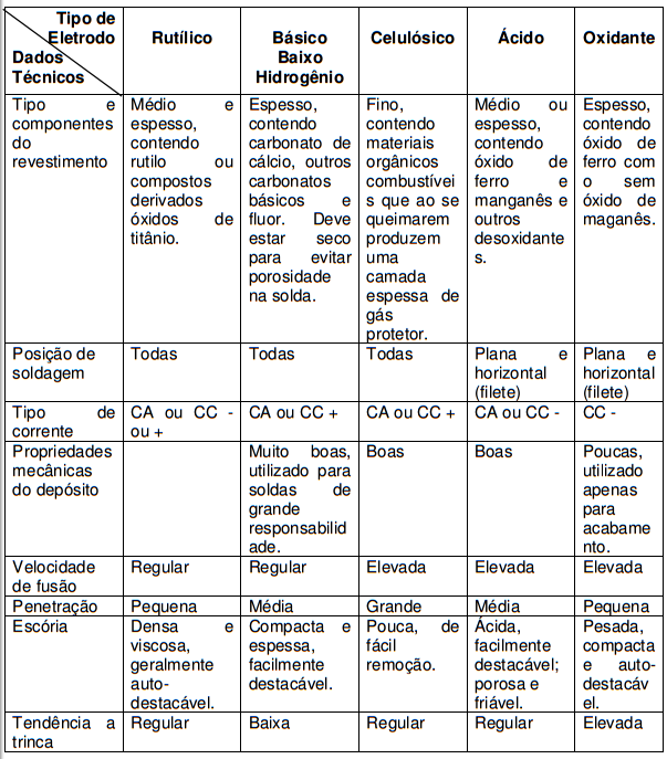 Os mais comuns são: rutílico, básico, celulósico, ácido e oxidante.