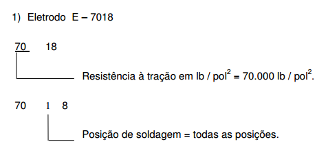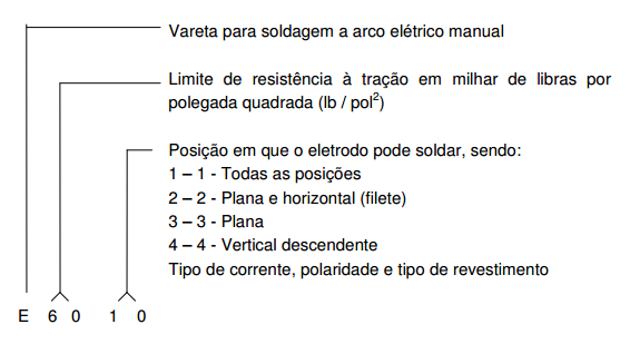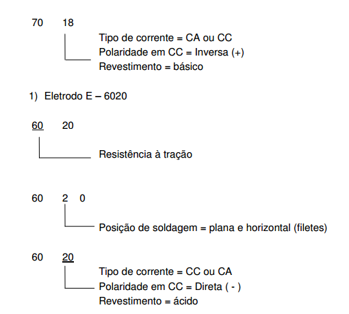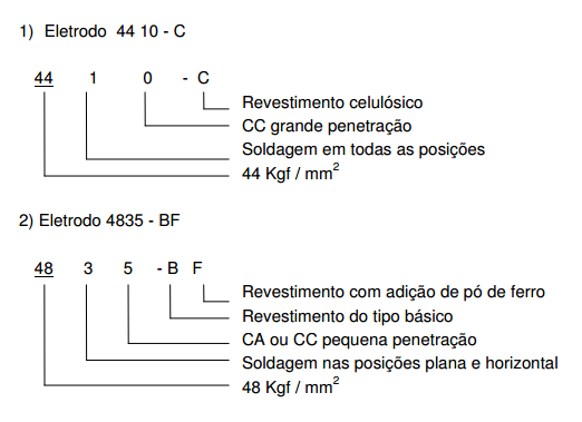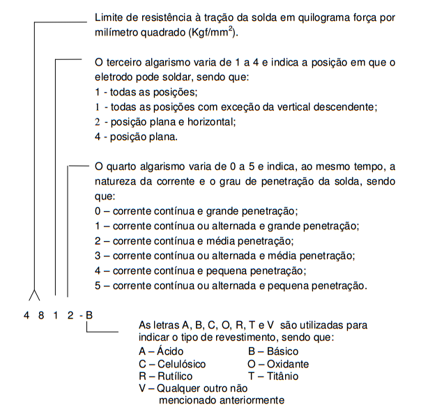 Os eletrodos são identificados por quatro algarismos, seguidos de uma letra. Os quatro algarismos básicos, identificadores de eletrodo têm o seguinte significado: