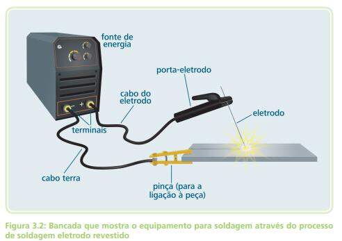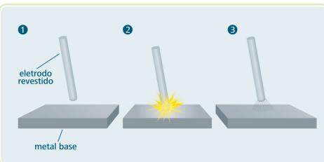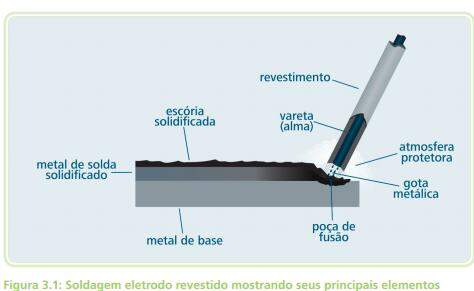 É um processo de soldagem ao arco elétrico com eletrodo revestido que consiste na abertura e na manutenção de um arco elétrico entre o eletrodo revestido e a peça a ser soldada, de modo a fundir simultaneamente o eletrodo e a peça. O metal fundido do eletrodo é transferido para a peça, formando uma poça de metal fundido que é protegida da atmosfera pelos gases de combustão do eletrodo e elementos geradores de escória presentes no revestimento e que são incorporados ao metal fundido no ato da combustão do revestimento exemplificado, de modo esquemático na Figura 3.1.