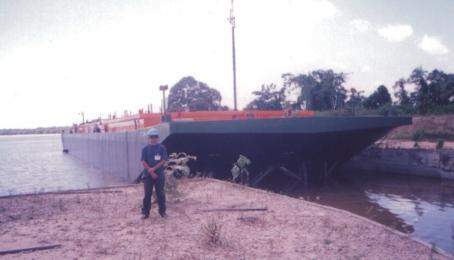 Autor deste trabalho posando para fotografia em frente da balsa graneleira Dona Gina Maçari recém-construída e posicionada no dique para inspeções finais antes da liberação