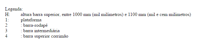 e) possuir rodapé de, no mínimo, 0,20 m (vinte centímetros) de altura e travessão intermediário a 0,70 m (setenta centímetros) de altura em relação ao piso, localizado entre o rodapé e o travessão superior.
