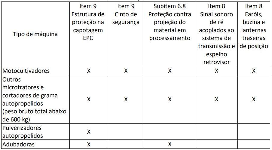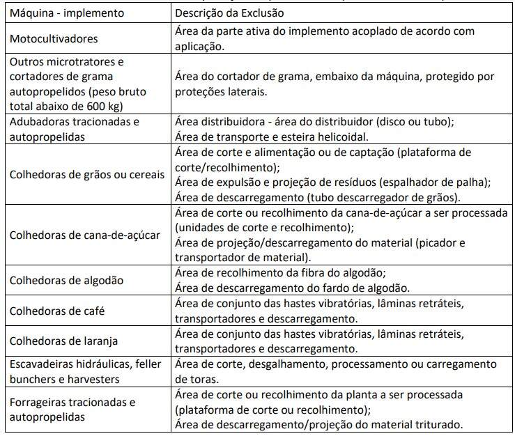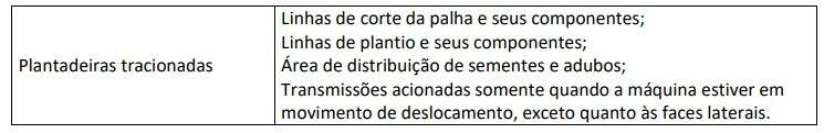 - Componentes funcionais das áreas de trabalho e processo das máquinas autopropelidas e implementos, que precisam ficar expostos para sua correta operação, tem que ser protegidos adequadamente até a extensão máxima possível, de maneira a estar permitindo a funcionalidade operacional a que se destinam, podendo atender às normas técnicas vigentes e às exceções constantes do quadro II do Anexo XI.