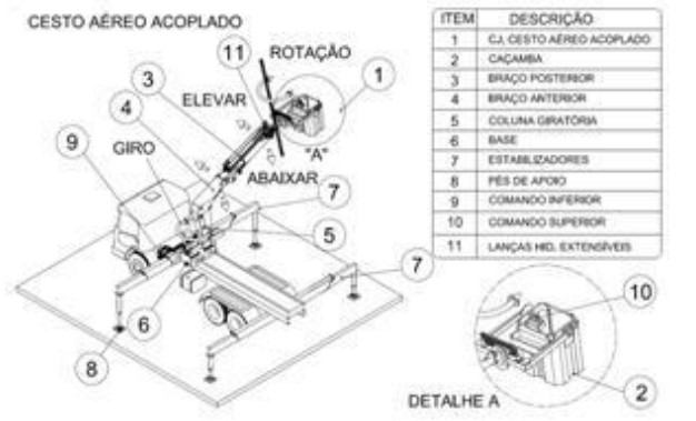 Cesto acoplado: Plataforma ou caçamba acoplada a um guindaste veicular para estar elevando pessoas e executando trabalhos em altura, com ou sem isolamento elétrico, podendo também estar elevando material de apoio indispensável para estar realizando o serviço.