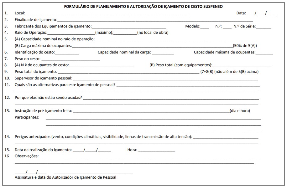 - Entre os ocupantes do cesto, ao menos um trabalhador tem que ser capacitado em código de sinalização ou em movimentação de carga.