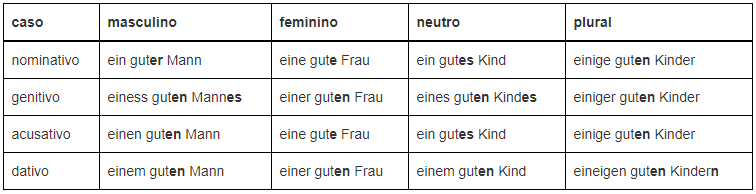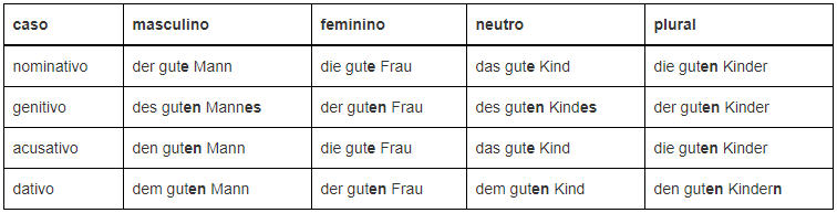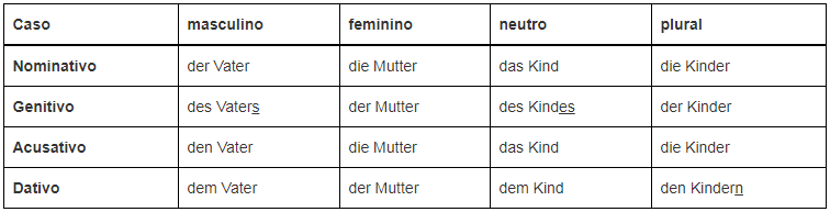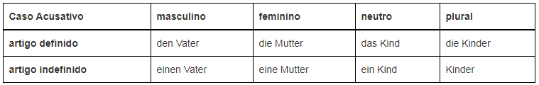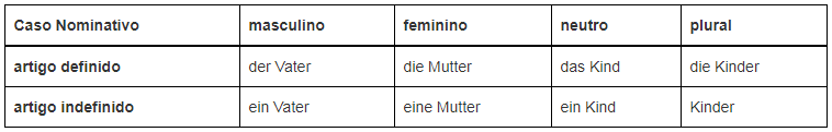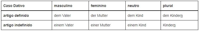 Ex.: Der Vater (nom. masc.) gibt der Mutter (dat. fem.) den Ring (ac. masc.) – O pai dá à mãe o anel.