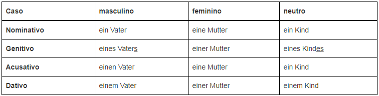 Ein Vater (nom. masc.) gibt einer Mutter (dat. fem.) einen Ring (ac. masc.) – Um pai dá a uma mãe um anel.