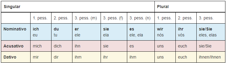 Os pronomes pessoais também são declinados: