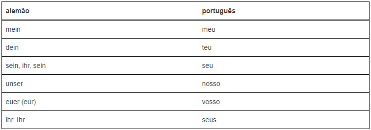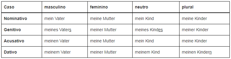 Veja a declinação do pronome possessivo meu (mein):
