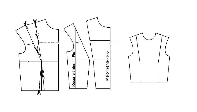 1-É importante notar que as crianças geralmente têm o ventre saliente, e para que a blusa ou vestido não fique levantado da frente é necessário descer de 1 a 2 cm no meio do molde frente (na barra), traçando com leve curva, da lateral até o meio.