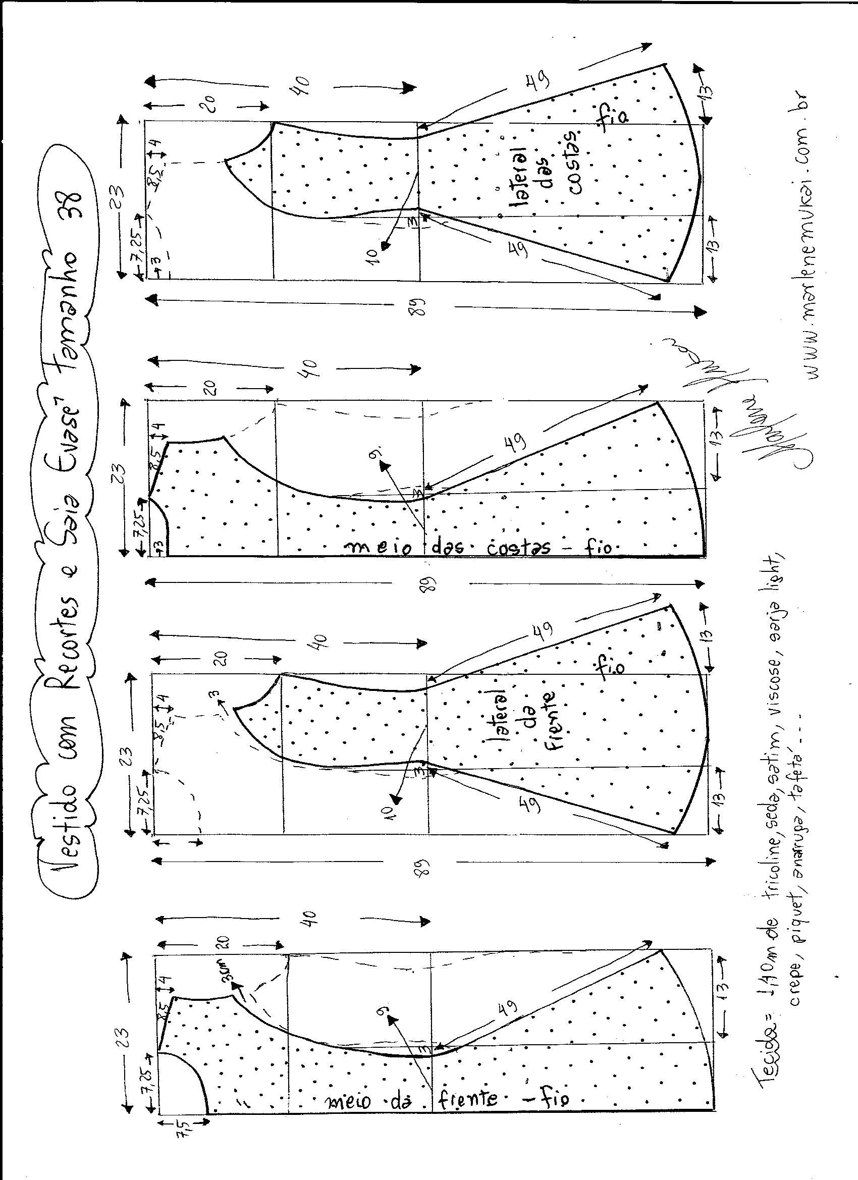 O molde apresentado é o da blusa ou vestido infantil modelo básico para tecido plano, no manequim nº 08, sem margens para costura, pelo qual pode ser desenvolvido qualquer outro modelo de blusa ou de vestido, como este que mostramos na foto. Ter um molde básico é muito mais interessante do que ter um modelo, pois com o primeiro poderão ser feitos infinitos desdobramentos. Como o corpo de meninos e meninas até a puberdade não tem diferença, são utilizados os mesmos básicos para os dois e também a modelagem infantil costuma ser feita frente e costas juntas, diferenciando apenas na cava, decote e ombro. Sugerimos, porém, para confecções mais direcionadas em modelos para meninas dos manequins 10 a 16 que desenvolvam o molde frente separado do molde costas. Podendo assim fazer uma modelagem mais feminina, mais cinturada talvez, pois hoje em dia as meninas querem se vestir igual às mamães; elas estão cada vez mais exigentes. As pequeninas querem elegância também, elas gostam do glamour, já tem seu próprio gosto. Com o sistema Anatômico, você terá total segurança ao traçar todos os números. Unindo nossa parte técnica com bom gosto, uma boa costura e combinações de cores e tecidos, certamente será bem-sucedido. Utilize-se sempre de detalhes que valorizam muito a vestimenta, principalmente na infantil, que deve agradar, em primeiro lugar, às mães. Frente e Costas: Observe que os moldes frente e costas estão juntos, porque em algumas partes são iguais, diferenciando na cava, ombro e decote.