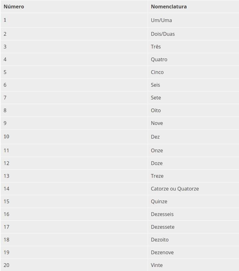 Tabela dos Números Cardinais: