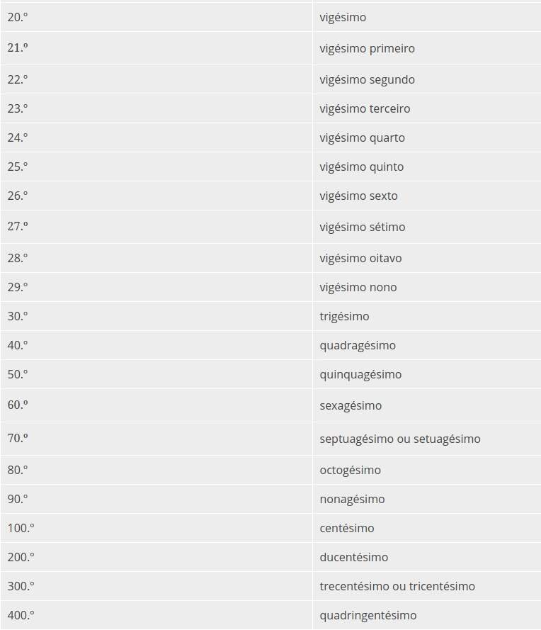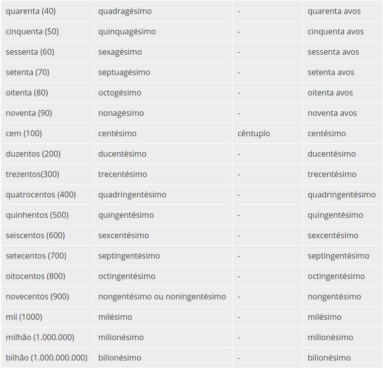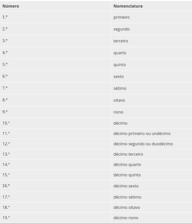 Para compreender melhor a nomenclatura dos números ordinais, segue abaixo alguns exemplos: