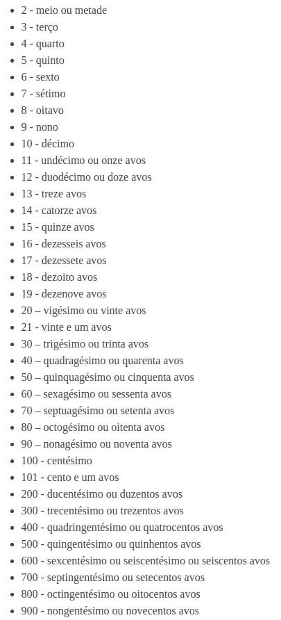 Lista de numerais fracionários: