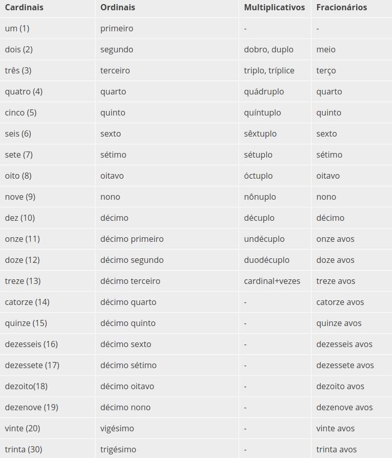 Tabela de Numerais: