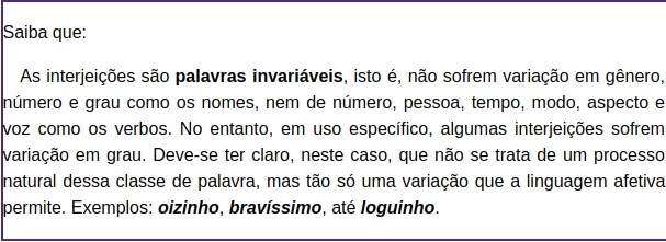 É a palavra invariável que exprime emoções, sensações, estados de espírito, ou que procura agir sobre o interlocutor, levando-o a adotar certo comportamento sem que, para isso, seja necessário fazer uso de estruturas linguísticas mais elaboradas. Observe o exemplo:
