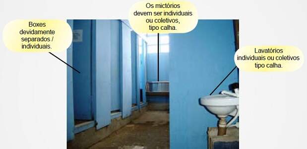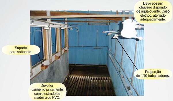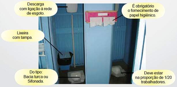 A instalação sanitária deve ser constituída de lavatório, vaso sanitário e mictório, na proporção de 1 (um) conjunto para cada grupo de 20 (vinte) trabalhadores ou fração, bem como de chuveiro, na proporção de 1 (uma) unidade para cada grupo de 10 (dez) trabalhadores ou fração.