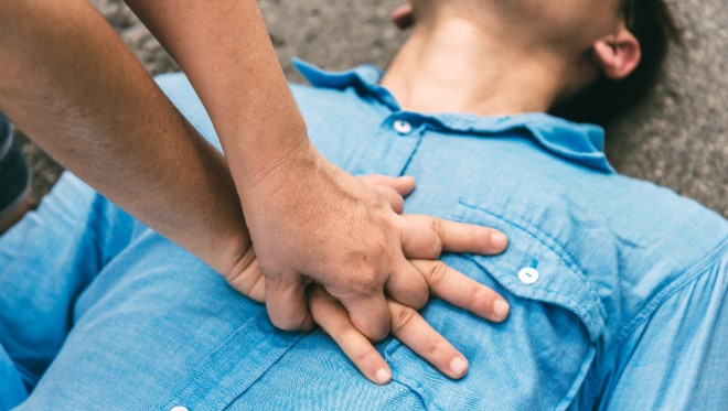 - Empurre a suas mãos com força contra o peito, deixando os braços esticados e usando o peso do próprio corpo, contando, no mínimo, 2 empurrões por segundo até chegar o serviço de resgate. É importante lembrar de deixar que o tórax do paciente volte a posição normal entre cada empurrão.