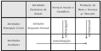 Os servidores públicos, e portanto integrantes de carreiras de Estado, serão apenas aqueles cujas atividades estão voltadas para as atividades exclusivas de Estado relacionadas com a formulação, controle e avaliação de políticas públicas e com a realização de atividades que pressupõem o poder de Estado. Esses servidores representarão o Estado enquanto pessoal. Para a realização de atividades auxiliares como manutenção, segurança e atividades de apoio diversas será dada continuidade ao processo de terceirização, transferindo-as para entidades privadas.