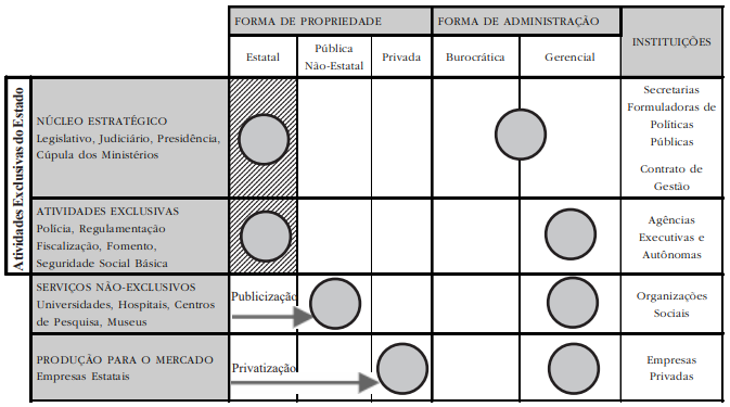 No núcleo estratégico a propriedade tem que ser necessariamente estatal. Nas atividades exclusivas de Estado, onde o poder extroverso de Estado é exercido, a propriedade também só pode ser estatal - representada institucionalmente, neste caso, pelas Agências Executivas.