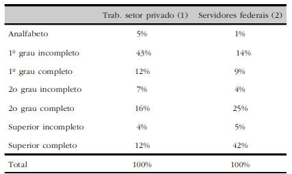 O servidor público possui, em média, um nível de escolaridade superior ao do trabalhador no setor privado. A tabela 1 mostra que, enquanto a maioria dos empregados na região metropolitana de São Paulo (onde o acesso à educação, ao que tudo indica, é mais facilitado) não concluiu o 2° grau,os servidores públicos federais possuem, predominantemente, curso superior completo. Se considerarmos que a informação relativa aos servidores reflete, via de regra, o seu nível de estudo quando do ingresso nos quadros de pessoal da União (haja vista que é rara a atualização destes dados cadastrais), esta disparidade pode ser ainda maior.
