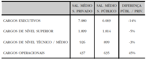 Existe no país uma crença generalizada de que a remuneração dos servidores públicos é baixa. A verdade não é exatamente essa. Elas são baixas para alguns setores, altas para outros.A tabela baseia-se em uma comparação entre os salários do setor público e do setor privado, na qual foram confrontadas as remunerações de cargos com atribuições semelhantes nos dois mercados. Para o cálculo do salário dos servidores, foi utilizada a estrutura de remuneração e a distribuição dos funcionários na escala salarial de cada cargo. Os dados foram coletados no SIAPE.