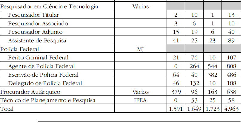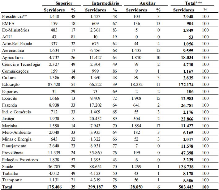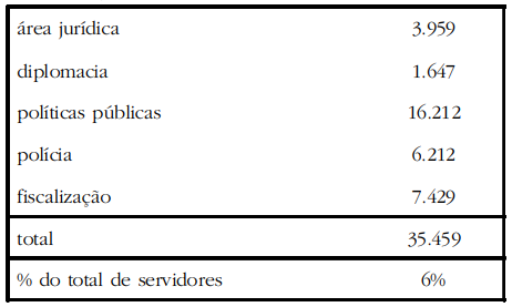 Além disso, existe um número reduzido de servidores nas áreas formuladoras de políticas e que pressupõem poderes de Estado: apenas 6% do total de servidores atua nas áreas de fiscalização, polícia, diplomacia, jurídica e orçamento, planejamento e gestão pública.