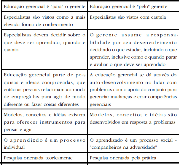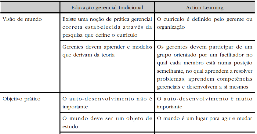 No quadro seguinte, Mc Laughlin e Thorpe (1993) mostram as principais características do Action Learning em oposição à visão tradicional da educação gerencial: