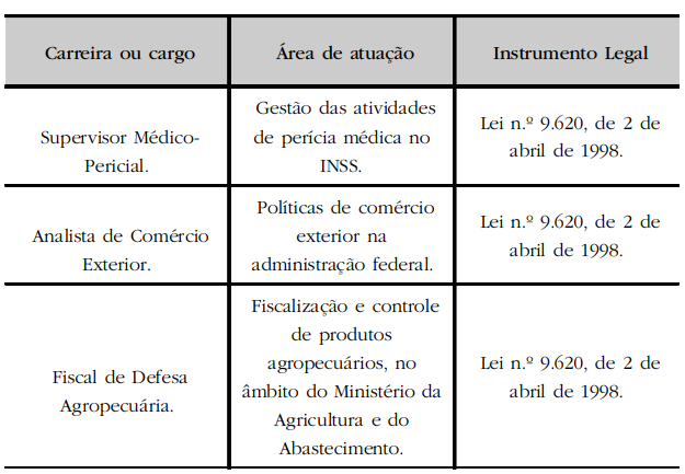 As recentes ações voltadas para a criação de novas carreiras visaram fortalecer a atuação do Estado em atividades essenciais e possibilitar a efetiva administração de seus recursos humanos. Para tanto foram criadas carreiras em áreas essenciais - supervisão médico-pericial, análise de comércio exterior e fiscalização de defesa agropecuária - com requisitos de maior qualificação para o ingresso, foram definidas atribuições amplas para as mesmas e criadas regras para facilitar o remanejamento de seus integrantes no interesse da administração pública concomitantemente a regras que garantam a sua unidade e a sua consolidação nos diversos órgãos. Além disso, parte da remuneração destas carreiras foi associada ao desempenho, em conformidade com os princípios da administração gerencial, voltada para resultados.