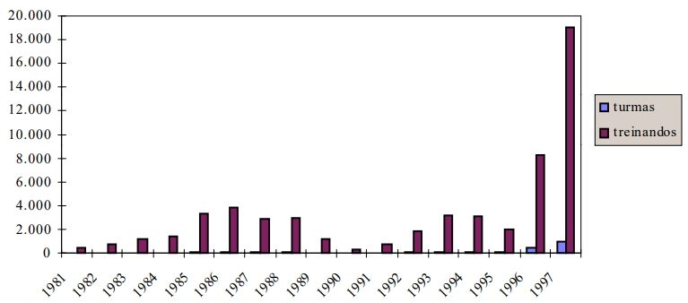 Em 1998, os resultados até o mês de junho perfazem 289 turmas, com 4.442 treinados, nos cursos já concluídos, sendo que a previsão é de alcançar 22 mil treinados até o final do ano. O gráfico a seguir apresenta os resultados anuais, desde o início das atividades da Escola.