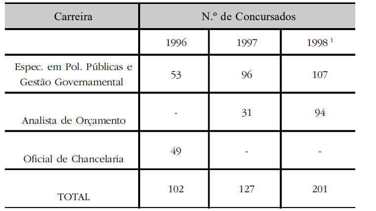 A programação de concursos públicos está sendo planejada considerando um horizonte de cinco anos. A programação em vigor para o recrutamento de quadros nas carreiras do Núcleo Estratégico alcança até o ano 2.000 e prevê o recrutamento de 7.225 servidores em 18 cargos e carreiras, mediante concursos públicos anuais. Com base na programação de concursos desde 1995, foram recrutados mediante concurso público, 4.963 servidores para atividades de alta qualificação, destinadas a resgatar a capacidade de formulação de